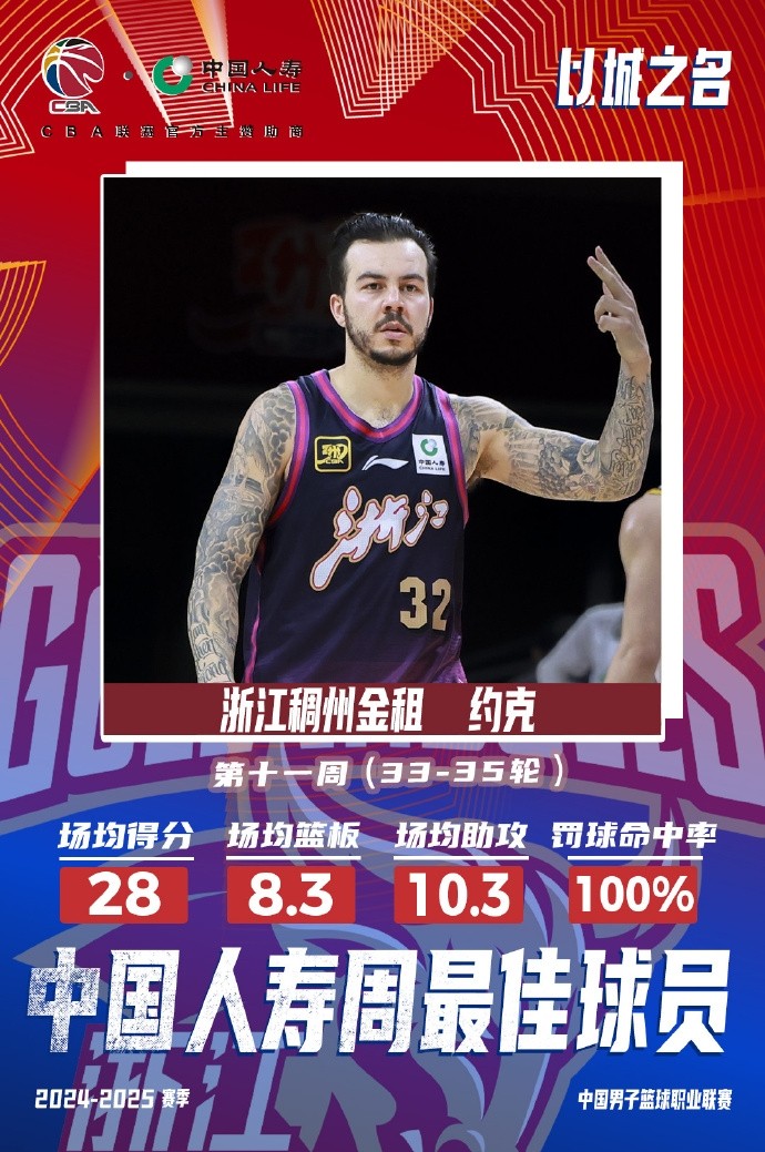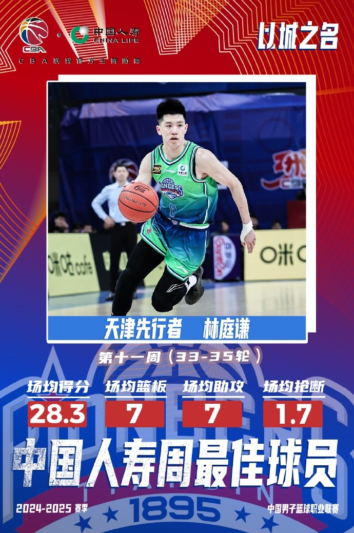 CBA官方公布了2024-2025赛季常规赛第十一周中国人寿周最佳球员,天津男篮林庭谦、稠州球员约克当选。