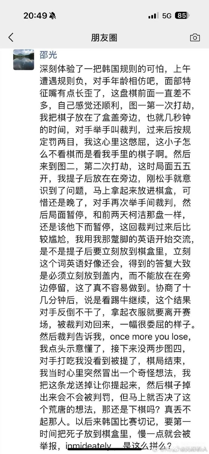 北京时间1月27日,博主“天涯棋人”更新社媒,发布了一张中国业余围棋名将邵光参加比赛后发布的朋友圈截图,他表示:深刻体验了韩国围棋规则的可怕,对手不看棋而是看我手里的棋子。