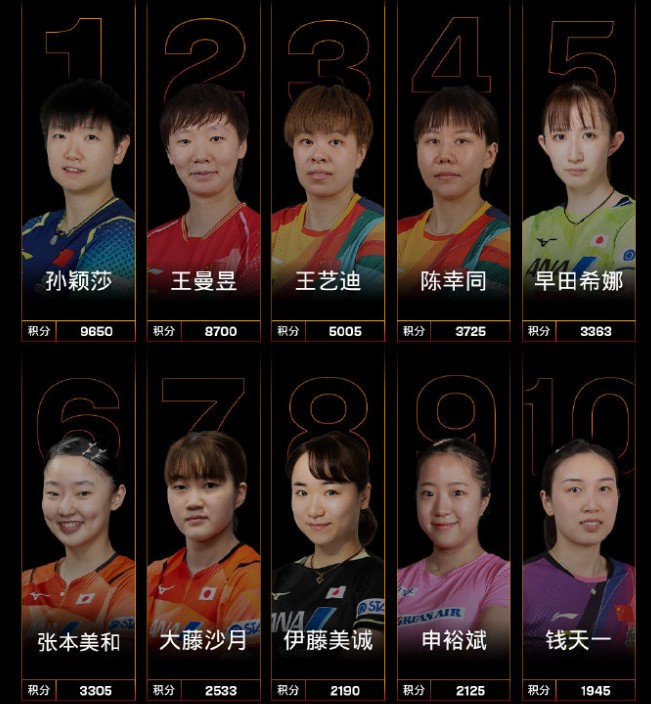 女子单打,中国队球员孙颖莎、王曼昱、王艺迪、陈幸同位列前四,钱天一位列第十。伊藤美诚排名上升2个名次位列第8;钱天一排名上升1个名次位列第10,重返世界排名前十;陈熠排名上升2个名次位列第24,刷新个人职业生涯新高。