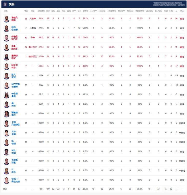 洛杉矶快船祖巴茨25分16板4助,哈登24分6板10助,鲍威尔23分5板2助,莱昂纳德17分5板2助。