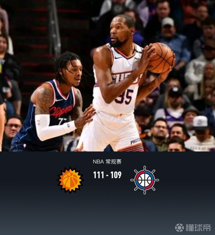 太阳111-109险胜快船,杜兰特24分,哈登24+6+10,布克26+7+8