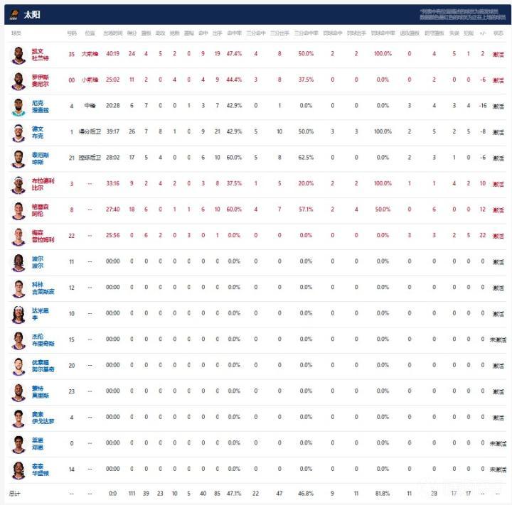 菲尼克斯太阳德文-布克26分7板8助,杜兰特24分4板5助,阿伦18分6板,比尔9分2板4助;