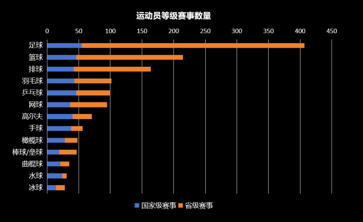 第一盘,我们来比一比官方赛事的数量,更准确地说是运动员等级赛事的数量。这是中国国情下,赛事建制方面最重要的度量衡,由体育总局发布。其中,中国足球407项赛事,排在所有球类项目首位,相比之下中国乒乓球就只有100项赛事。中国乒乓球先输一盘。