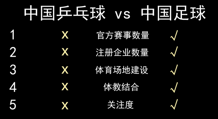 我知道很多人不认可这个结论,他们会说,官方的数据未必靠谱啊,这些数据不重要啊,数据不能说明所有问题啊。那行,那麻烦各位找回五个统一的度量衡,拿出五个各位认为重要的数据,来证明中国乒乓球好过足球吧……