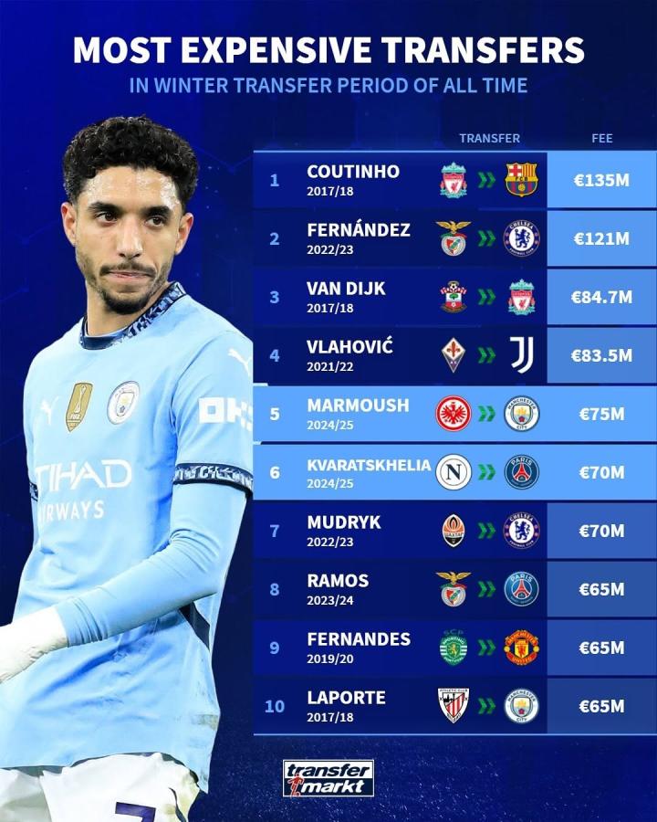 冬窗还有不到一周的时间就将结束,北京时间1月28日,德国转会市场列出了冬窗历史引援榜,其中今年冬窗有两笔引援上榜,分别是曼城引进马尔穆什和巴黎引进克瓦拉茨赫利亚。