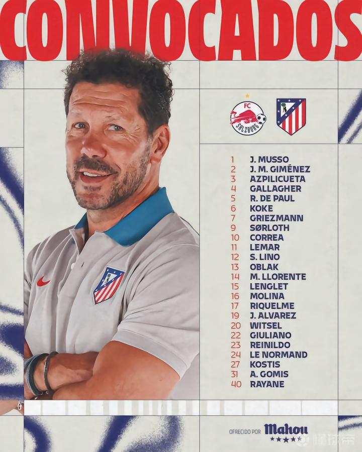 北京时间1月30日凌晨4点,马竞将迎来欧冠联赛阶段第8轮客场对阵萨尔茨堡红牛的比赛,赛前,马竞官方公布了本场比赛的大名单,其中巴里奥斯停赛,哈维-加兰伤缺。
