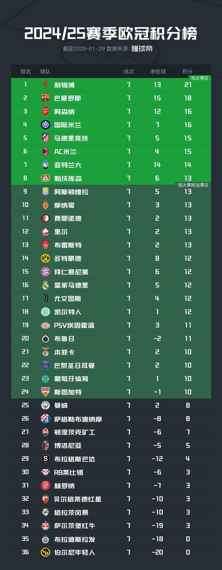 在整个联赛阶段,局势变幻莫测,几乎每场比赛的结果都会让球队排名上升或下降。在联赛阶段第8轮比赛前,8月摩纳哥抽签中的9支一号种子球队中,只有利物浦、巴塞罗那和国际米兰三支球队位居积分榜前八这一令人垂涎的位置,这清楚地表明了新赛制的流动性。