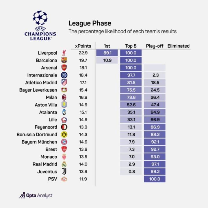 至少锁定附加赛席位:阿森纳、国际米兰、马德里竞技、AC米兰、亚特兰大、勒沃库森、阿斯顿维拉、摩纳哥、费耶诺德、里尔、布雷斯特、多特蒙德、拜仁慕尼黑、皇家马德里、尤文图斯、凯尔特人