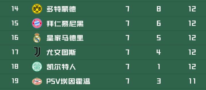 欧冠第14-19的六支球队居然都是前欧冠冠军,多特1冠,拜仁6冠,皇马15冠,尤文2冠,凯尔特人1冠,埃因霍温1冠。这6支球队想进入前八的可能性不大,但会力争一个更好地附加赛排位,同时期待惊喜。