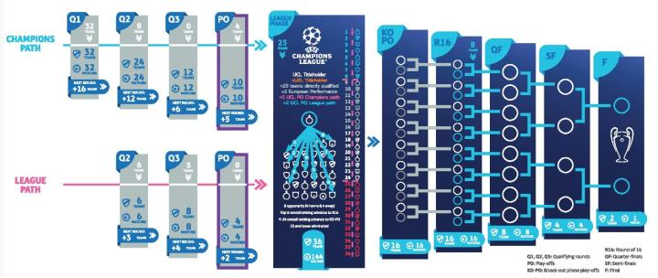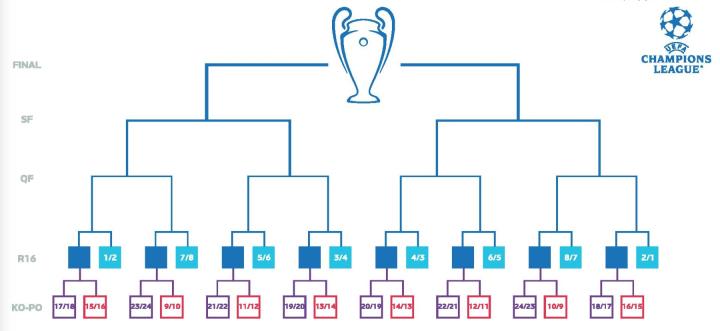 根据规则,欧冠联赛阶段前八名直接晋级十六强;9-24名进入到淘汰赛附加赛,其中9-16名为种子队,17-24名为非种子队;25-36名直接淘汰,不会再有降级到欧联的规则。