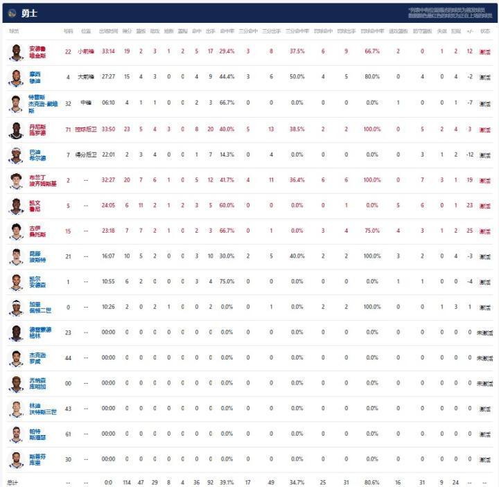 金州勇士施罗德23分5板4助3断,波杰姆斯基20分7板6助1断,维金斯19分2板3助1断2帽;
