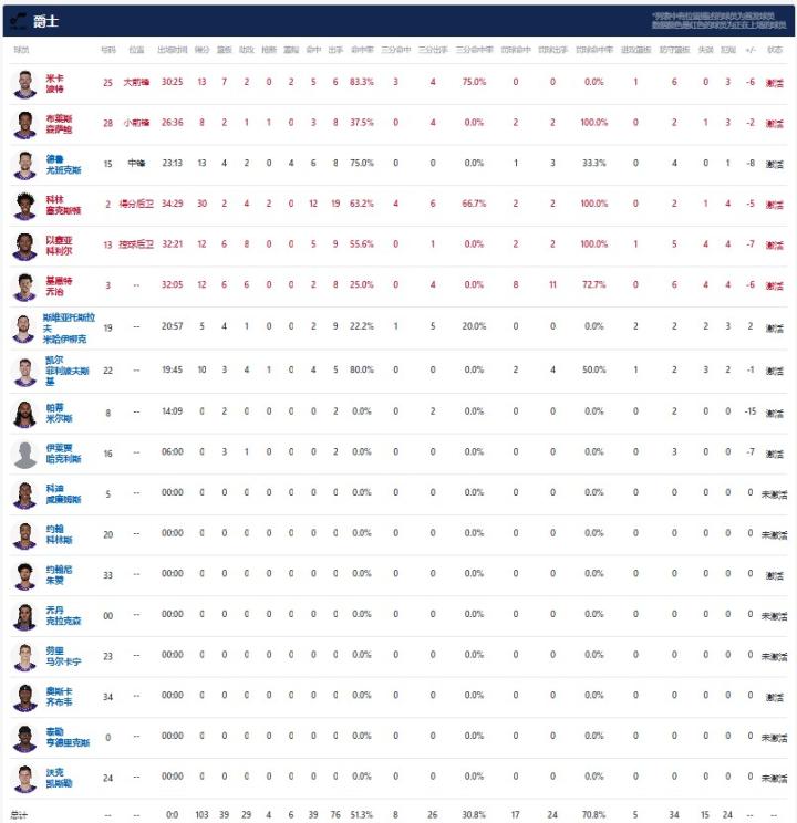 犹他爵士塞克斯顿30分2板4助2断,尤班克斯13分4板2助4帽,迈卡-波特13分7板2助2帽。