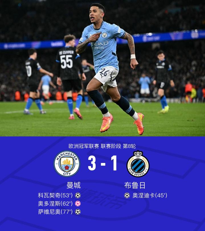 曼城3-1布鲁日晋级淘汰赛附加赛,科瓦契奇破门,格瓦造乌龙