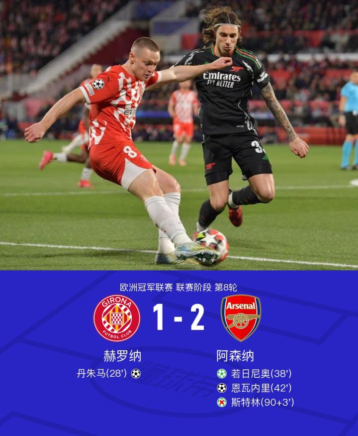 在欧洲冠军联赛的较量中,赫罗纳迎战阿森纳。比赛中,赫罗纳的丹朱马在队友胡安佩的助攻下成功破门,为球队取得领先。随后,阿森纳的若日尼奥通过点球扳平比分。紧接着,恩瓦内里在特罗萨德的助攻下再下一城,为阿森纳反超比分。比赛接近尾声时,阿森纳的斯特林错失了一次点球机会。最终,阿森纳以2比1战胜赫罗纳。