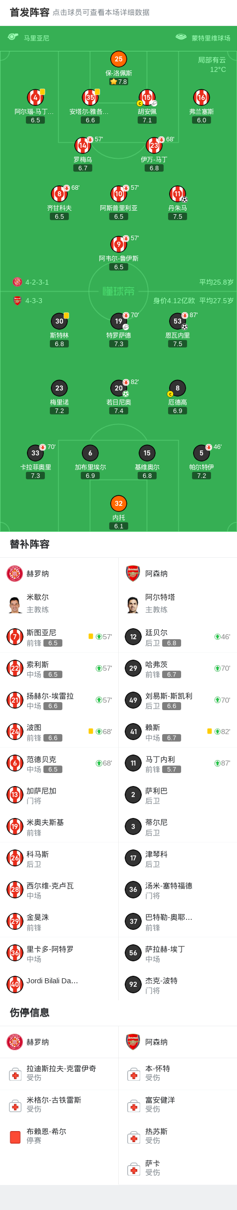第29分钟,打破僵局,丹朱马远距离兜射破门,赫罗纳1-0阿森纳