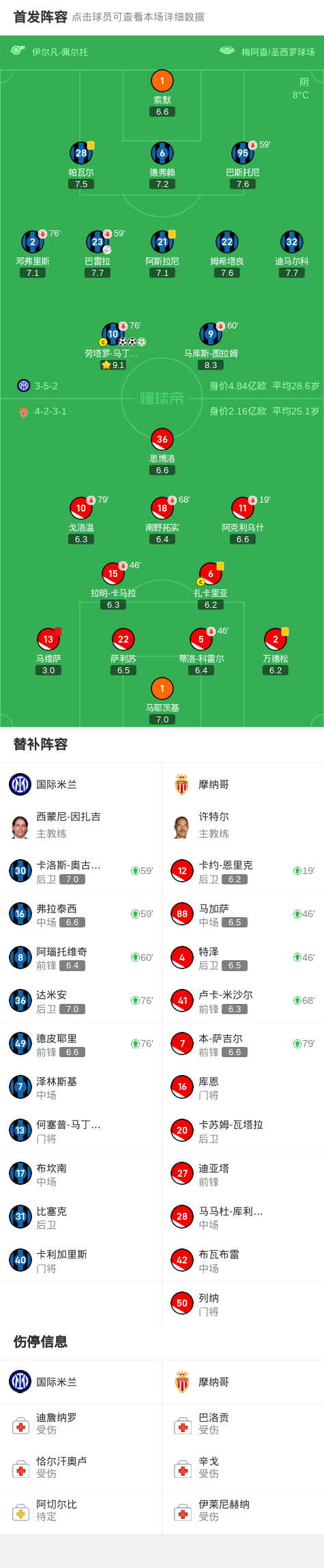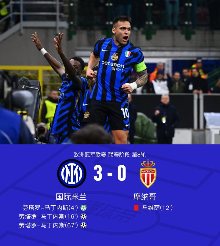 国米3-0十人摩纳哥晋级16强,劳塔罗帽子戏法,马维萨直红