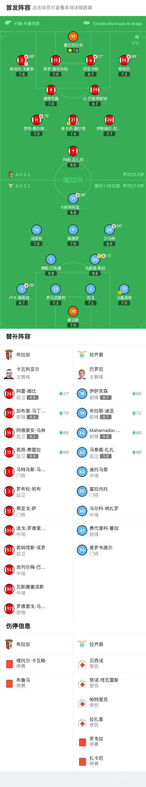 在欧足联欧洲联赛的较量中,布拉加与拉齐奥展开了一场激烈的对决。上半场,里卡多-奥尔塔先拔头筹。下半场最后时刻,马丁内斯破门被吹。全场比赛结束,拉齐奥尽管0-1失利,但是还是以第一名的成绩直接晋级16强。
