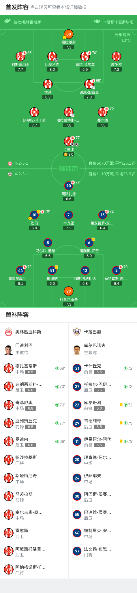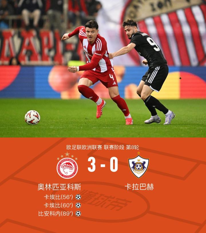 奥林匹亚科斯3-0卡拉巴赫,卡埃比双响,比安科内破门