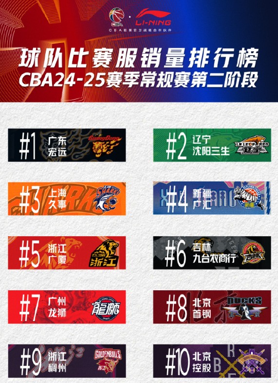 相较于第一阶段的销售量而言,球队球衣方面,广东男篮反超辽宁队成为第二阶段销量最高的球队,上海久事从第五来到第三,新疆队从第八升至第四。