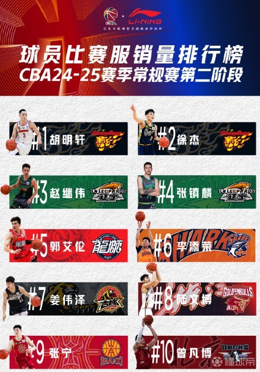 球员球衣方面,胡明轩超越赵继伟来到第一,徐杰凭借第二阶段的出色表现从第9升至第二,上阶段未上榜的李添荣、陆文博在本阶段分别排在第6和第8。