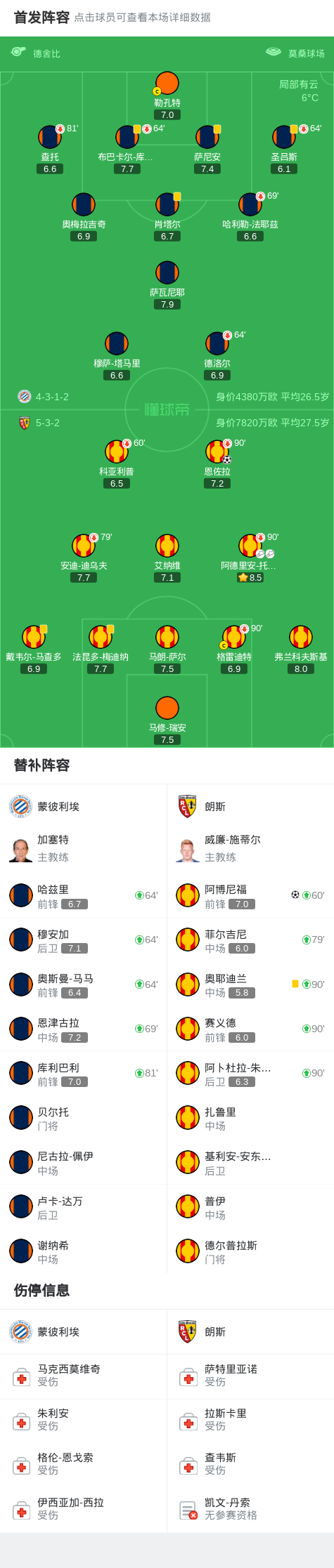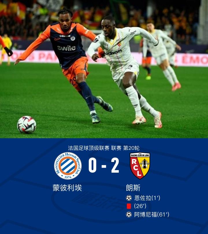 蒙彼利埃0-2朗斯,双方主帅被罚下,恩佐拉、阿博尼福建功