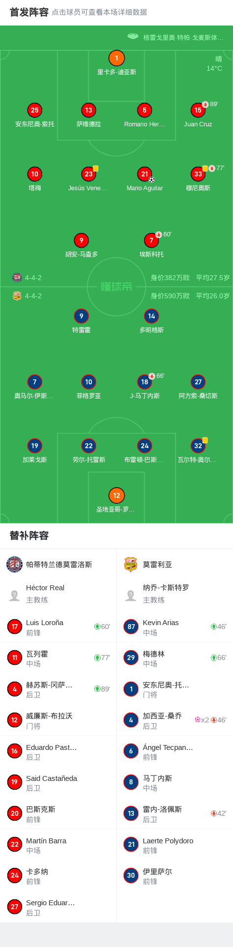 第50分钟,帕蒂特兰德莫雷洛斯球员Mario Aguilar打入一球。