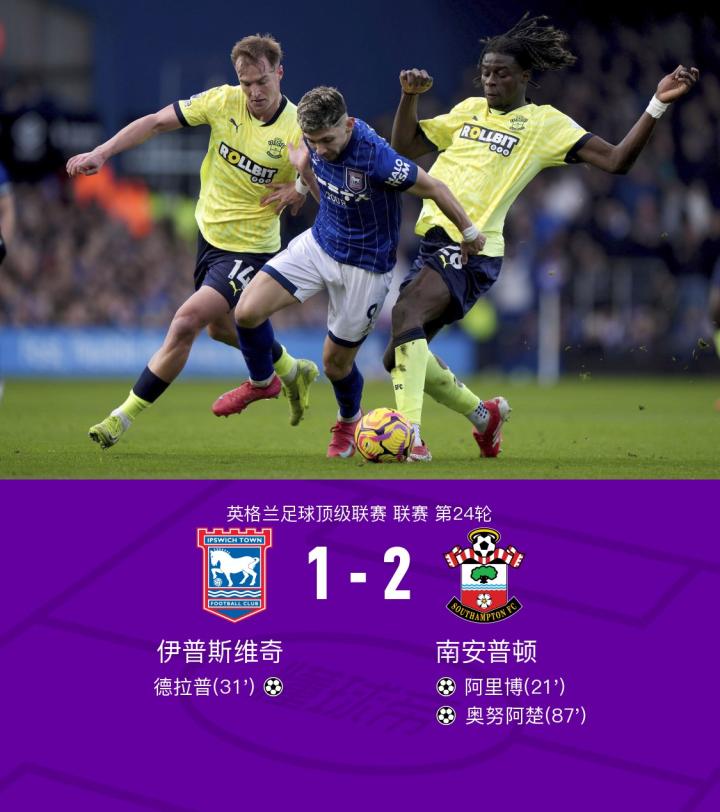 在英格兰足球顶级联赛第24轮的较量中,伊普斯维奇坐镇主场迎战南安普顿。比赛中,南安普顿的阿里博率先为球队取得领先。随后,伊普斯维奇的德拉普迅速扳平比分。临近比赛结束时,南安普顿的奥努阿楚再度攻入一球,帮助球队锁定胜局。最终,南安普顿以2比1战胜伊普斯维奇。