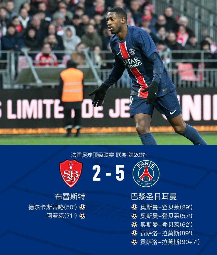 巴黎客场5-2布雷斯特,登贝莱连场戴帽,贡萨洛-拉莫斯双响