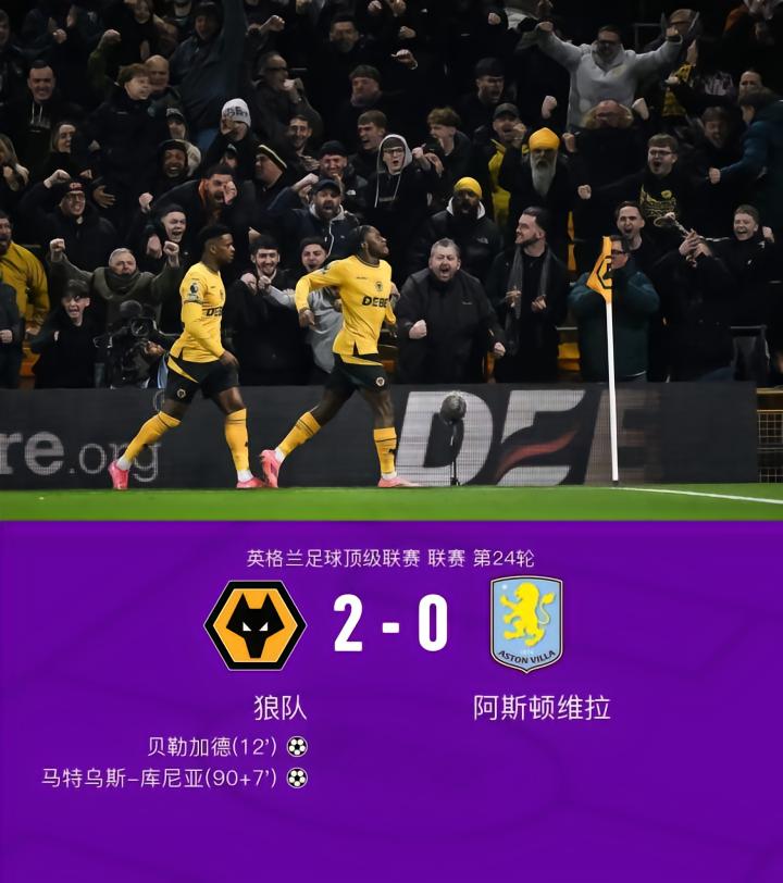在英格兰足球顶级联赛第24轮的较量中,狼队坐镇主场迎战阿斯顿维拉。比赛中,狼队展现了出色的进攻能力。首先,贝勒加德在队友萨拉维亚的精妙助攻下,成功攻破对方球门,为球队首开纪录。随后,马特乌斯-库尼亚再度发威,凭借个人能力再下一城,进一步扩大了领先优势。最终,狼队以2-0的比分战胜阿斯顿维拉,取得了一场重要的胜利。