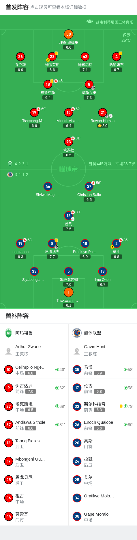 在南非超级联赛第15轮的较量中,阿玛祖鲁坐镇主场迎战超体联盟。比赛中,阿玛祖鲁的Rowan Human表现出色,他不仅为球队首开纪录,还在比赛后期助攻莫斯瓦里再下一城。超体联盟方面,恩德洛夫在普列的助攻下为球队扳回一球。最终,阿玛祖鲁以2-1战胜超体联盟,取得了本场比赛的胜利。
