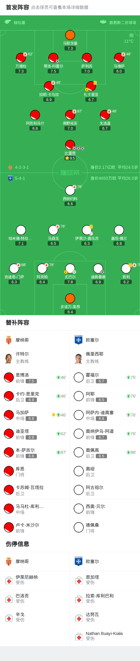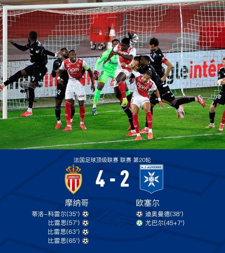 摩纳哥4-2逆转欧塞尔,比雷思八分钟戴帽,恩博洛两助攻