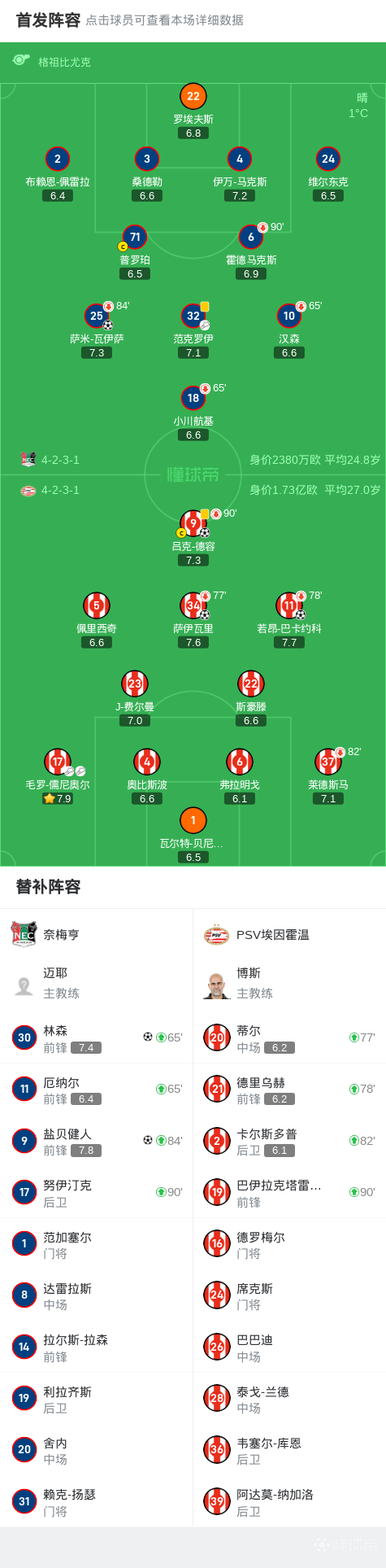 下半场补时第5分钟,奈梅亨球员范克罗伊助攻林森打入一球。