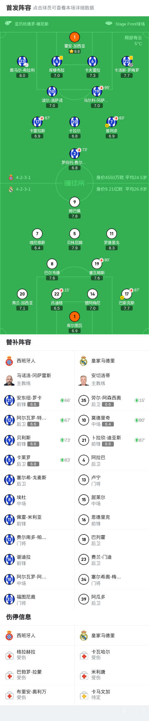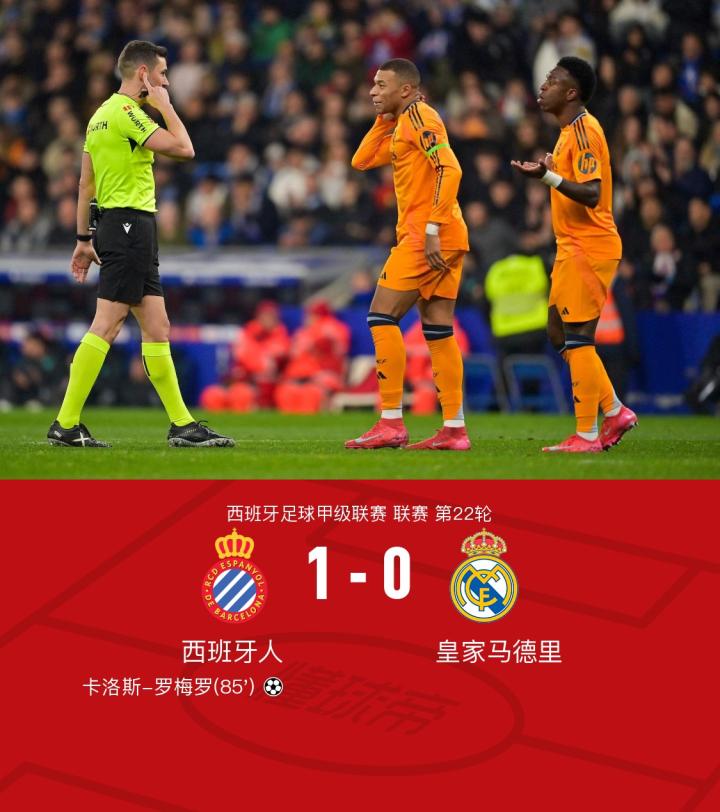 北京时间2月2日4:00,西甲第22轮,皇家马德里客场挑战西班牙人。上半场,吕迪格受伤被劳尔-阿森西奥换下,姆巴佩推人犯规在先,维尼修斯进球被吹,贝林厄姆兜射被门将没收。下半场,贝林厄姆远射被扑出,姆巴佩补射击中门框,巴尔韦德任意球攻门被封堵,维尼修斯远射打偏,罗德里戈外脚背捅射击中门框,随后卡洛斯-罗梅罗飞铲姆巴佩被黄牌警告,比赛尾声阶段,卡洛斯-罗梅罗接队友传中推射破门,最终,皇马客场0-1西班牙人,各项赛事五连胜遭终结。