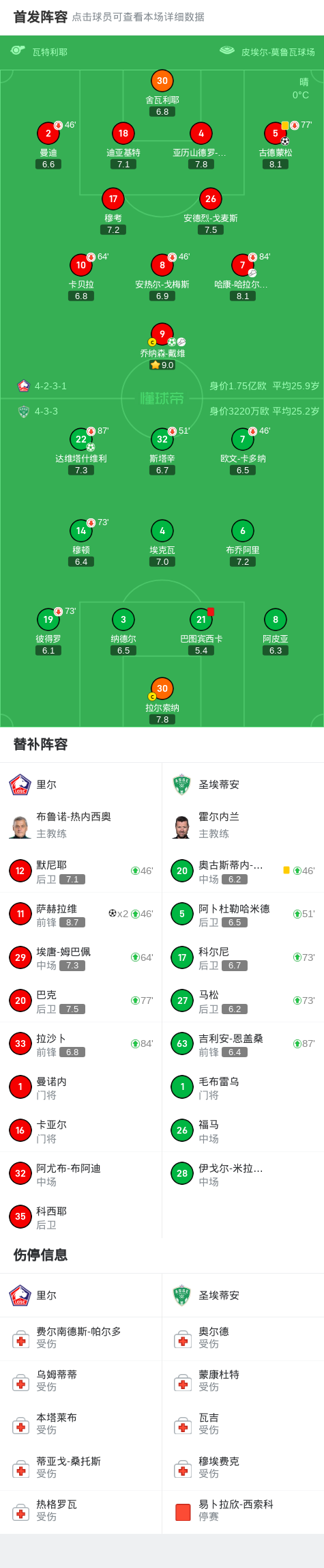里尔4-1逆转十人圣埃蒂安,乔纳森-戴维传射,萨赫拉维双响