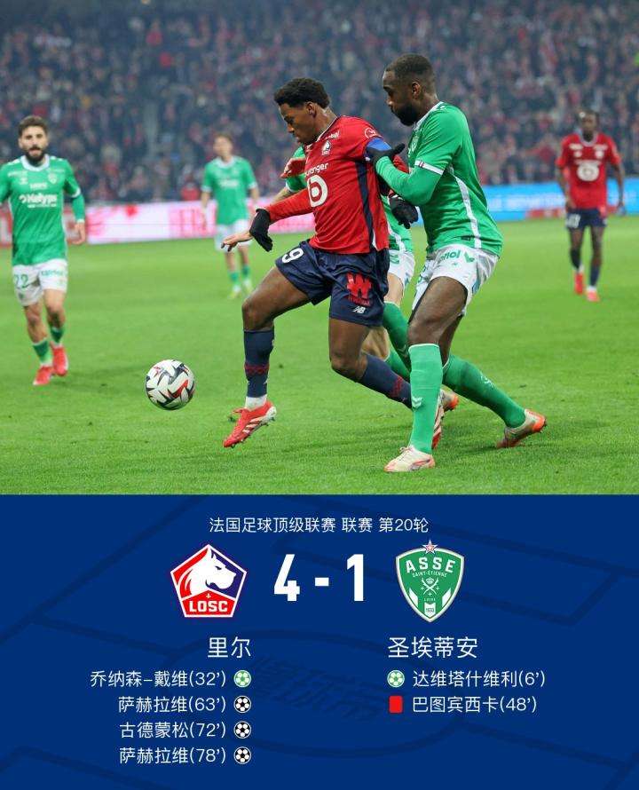 在法国足球顶级联赛第20轮的较量中,里尔坐镇主场迎战圣埃蒂安。比赛伊始,圣埃蒂安的达维塔什维利率先通过点球为球队取得领先。然而,里尔迅速做出回应,乔纳森-戴维同样以点球扳平比分。下半场,圣埃蒂安的巴图宾西卡被罚下场。乔纳森-戴维送出助攻,萨赫拉维成功破门,帮助里尔反超比分。随后,古德蒙松和萨赫拉维接连破门。全场比赛结束,里尔4-1逆转击败圣埃蒂安。