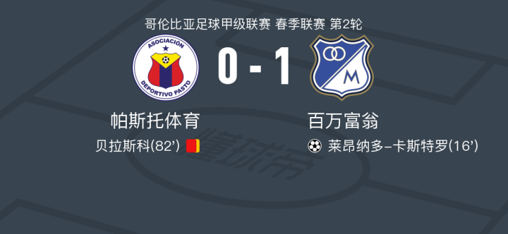 在哥伦比亚足球甲级联赛春季联赛的较量中,帕斯托体育坐镇主场迎战百万富翁。比赛中,百万富翁的莱昂纳多-卡斯特罗在队友曼蒂利亚的精妙传球下成功破门,为球队取得领先。比赛后期,帕斯托体育的贝拉斯科因累计两张黄牌被罚下场,球队陷入被动。最终,百万富翁凭借这一进球,以1比0小胜帕斯托体育,取得了比赛的胜利。