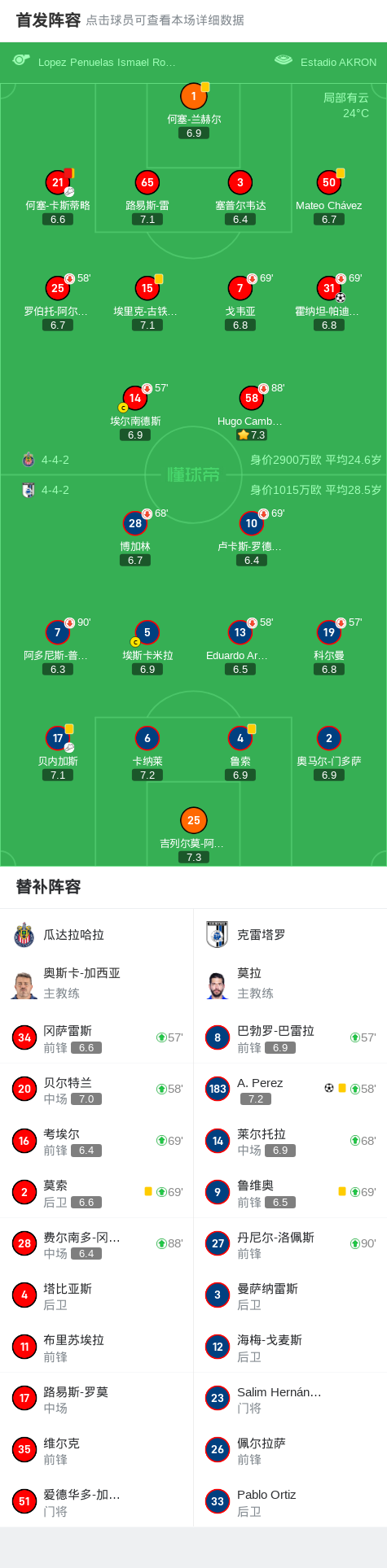 在墨西哥足球超级联赛秋季联赛第5轮的比赛中,瓜达拉哈拉坐镇主场迎战克雷塔罗。比赛中,瓜达拉哈拉的何塞-卡斯蒂略送出精妙助攻,帮助霍纳坦-帕迪利亚成功破门,为主队取得领先。随后,克雷塔罗的贝内加斯也不甘示弱,助攻A. Perez扳平比分。比赛接近尾声时,瓜达拉哈拉的何塞-卡斯蒂略因累计两张黄牌被罚下场。最终,双方以1-1握手言和。