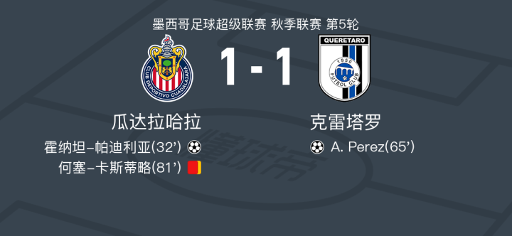 瓜达拉哈拉1-1克雷塔罗,霍纳坦-帕迪利亚破僵,A. Perez扳平