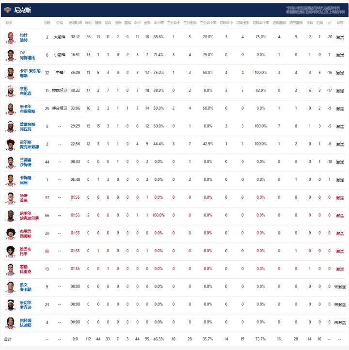 纽约尼克斯约什-哈特26分13板11助2断,布伦森17分2板7助1断,米卡尔-布里奇斯16分2板2助1断1帽;