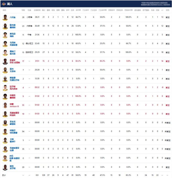 洛杉矶湖人詹姆斯33分11板12助,里夫斯27分5板6助3断,八村垒21分3板2助1断1帽。