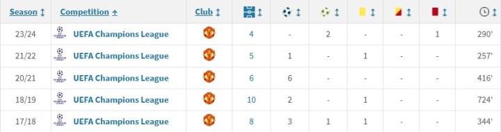 拉什福德曾代表曼联共参加过33场欧冠比赛,共打进过12粒进球,3次助攻。
