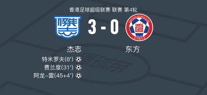 在香港足球超级联赛第4轮的比赛中,杰志坐镇主场迎战东方。比赛中,杰志展现了强大的进攻实力。特米罗夫率先为球队打开局面,随后费兰度再下一城,进一步扩大领先优势。上半场结束前,阿龙-雷的精彩进球为杰志锁定胜局。最终,杰志以3比0完胜东方,取得了一场令人信服的胜利。