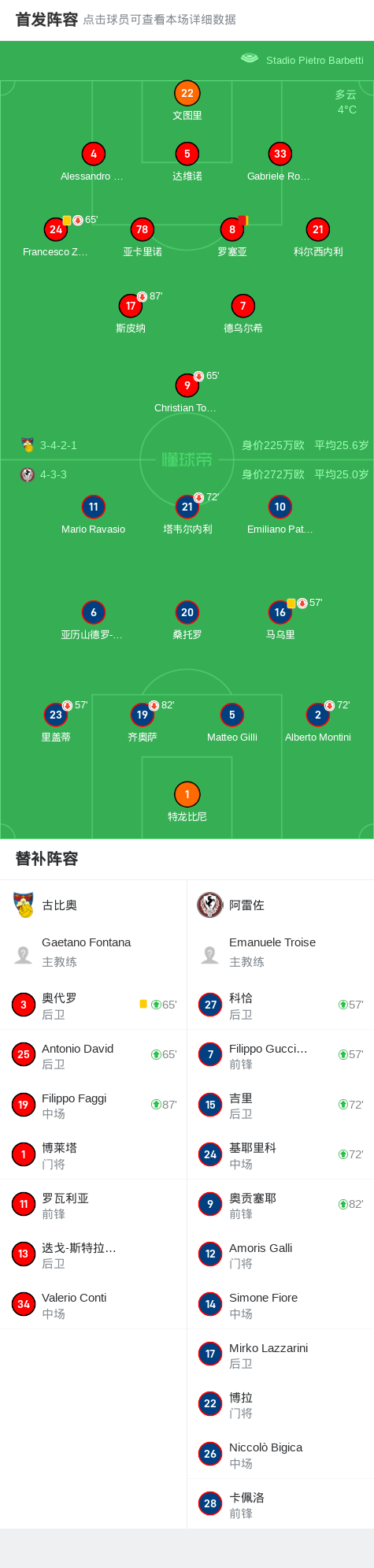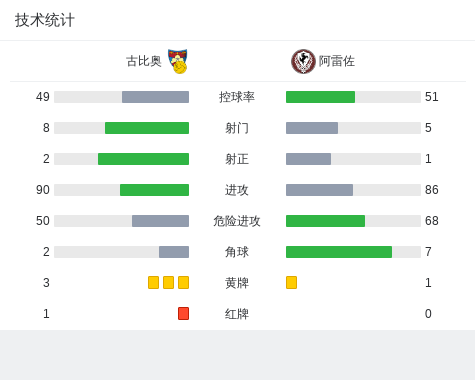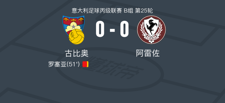 古比奥0-0阿雷佐,双方破门乏术战报bot @懂球帝2025-02-02 21:20在意大利足球丙级联赛B组第25轮的较量中,古比奥坐镇主场迎战阿雷佐。比赛中,古比奥的罗塞亚因累计两张黄牌被罚下场,尽管如此,双方在场上均未能攻破对方球门,最终以0-0的比分握手言和。点击查看本场比赛详细数据>>点击查看意丙完整积分榜>>精彩瞬间第51分钟,古比奥球队罗塞亚吃到第二张黄牌。 球队阵容 技术统计 展开更多
