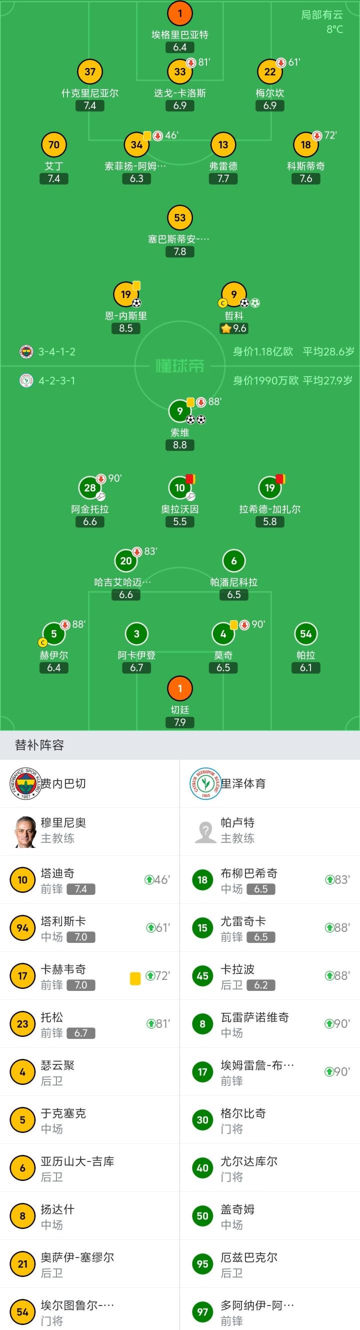 费内巴切让二追三3-2九人里泽体育,恩-内斯里绝杀,哲科双响