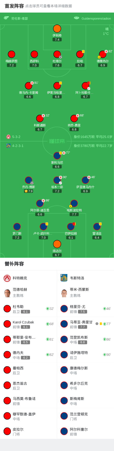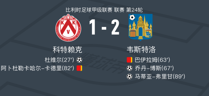在比利时足球甲级联赛第24轮的较量中,科特赖克坐镇主场迎战韦斯特洛。比赛中,科特赖克的杜维尔在队友阿卜杜勒卡哈尔-卡德里的助攻下成功破门,为主队取得领先。然而,韦斯特洛并未轻易放弃,乔丹-博斯在坂本一彩的助攻下扳平比分。比赛接近尾声时,马蒂亚-弗里甘在格里芬-尤的助攻下再下一城,帮助韦斯特洛反超比分。最终,韦斯特洛以2-1的比分逆转战胜科特赖克。比赛中,双方各有一名球员因累计黄牌被罚下场,比赛的激烈程度可见一斑。
