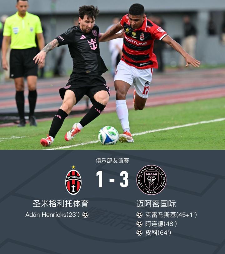 在一场激烈的俱乐部友谊赛中,圣米格利托体育迎战迈阿密国际。上半场,圣米格利托体育的亨里克斯首开记录;随后梅西直传策动,韦甘特助攻克雷马斯基扳平比分。下半场,苏亚雷斯直塞助攻阿连德破门,紧接着梅西再度策动进球,戴维-鲁伊斯助攻皮科建功。最终,迈阿密国际3-1击败圣米格利托体育。