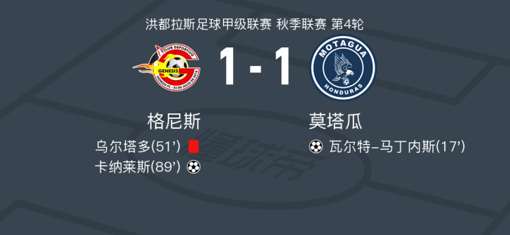 在洪都拉斯足球甲级联赛秋季联赛第4轮的比赛中,格尼斯坐镇主场迎战莫塔瓜。比赛中,莫塔瓜的瓦尔特-马丁内斯率先为球队取得进球,帮助客队取得领先。随后,格尼斯遭遇不利局面,乌尔塔多被罚下场。然而,格尼斯并未放弃,卡纳莱斯在比赛接近尾声时成功扳平比分。最终,双方以1-1握手言和。