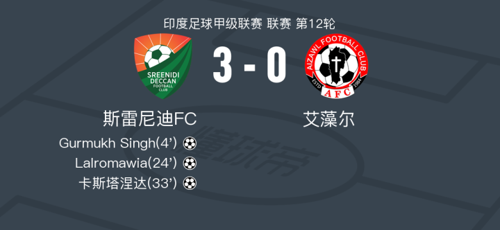 在印度足球甲级联赛第12轮的比赛中,斯雷尼迪FC坐镇主场迎战艾藻尔。比赛中,斯雷尼迪FC展现了强大的进攻实力。首先,Gurmukh Singh接到队友奥雷利恩的精妙传球,成功破门,为球队首开纪录。随后,Lalromawia在威廉的助攻下,再次攻破对方球门,扩大了领先优势。紧接着,卡斯塔涅达在哈迪克-巴特的助攻下,打入了本场比赛的第三粒进球。最终,斯雷尼迪FC以3-0的比分完胜艾藻尔,取得了一场令人信服的胜利。
