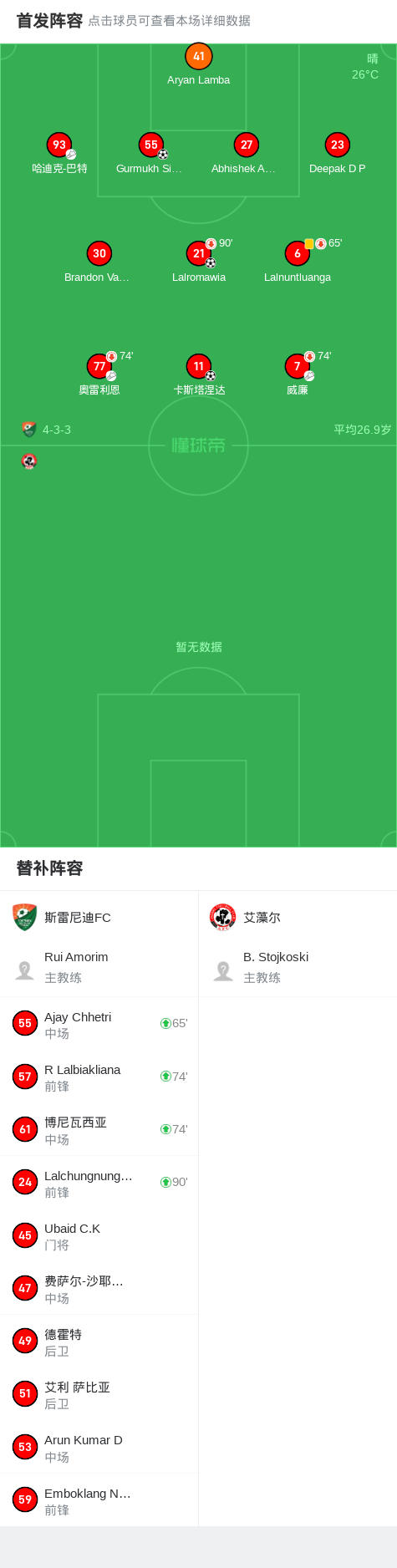 斯雷尼迪FC3-0大胜艾藻尔,卡斯塔涅达、Lalromawia破门