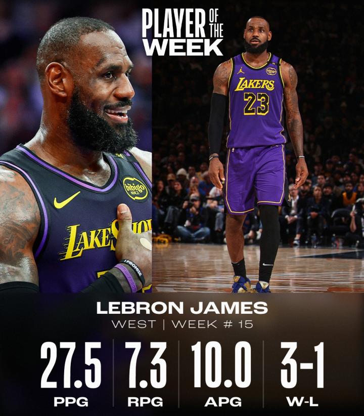 上周詹姆斯率领湖人取得了3胜1负的成绩,4场比赛现年40岁的詹皇场均拿下27.5分、7.3篮板以及10助攻的数据,最终当选上周西部最佳球员。